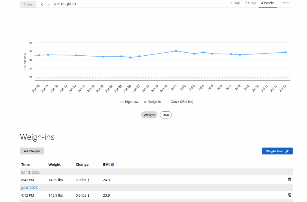 My weight, has gone up from whenever that last doctor’s visit was. My weight comes from a Senssun Life digital smart scale (that particular scale is no longer available, and while that’s the one from my shop history, that isn’t the exact same scale, mine doesn’t say Nutri Fit on it, but Senssun Life, though maybe they changed hands, and this was the last version of that scale), which then shares it’s data with Apple Health and Fitbit. Fitbit then shares that with Zwift and Garmin (and a couple others I think). The Garmin results are below for the last 4 weeks. Sadly none of those automatically sync the weight data over to MyWoosh yet.